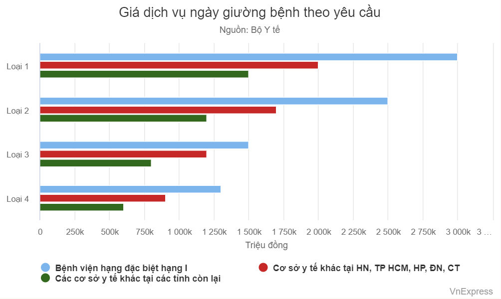 Giá giường nằm tại phòng điều trị theo yêu cầu (chưa bao gồm tiền thuốc, các dịch vụ kỹ thuật y tế) tối đa 3 triệu đồng một ngày với bệnh viện hạng đặc biệt, hạng một, mỗi phòng một giường. Cùng hạng bệnh viện này, nếu phòng có hai giường giá 2,5 triệu đồng/giường; phòng 3 giường giá 1,5 triệu đồng/giường, phòng 4 giường giá 1,3 triệu đồng/giường.