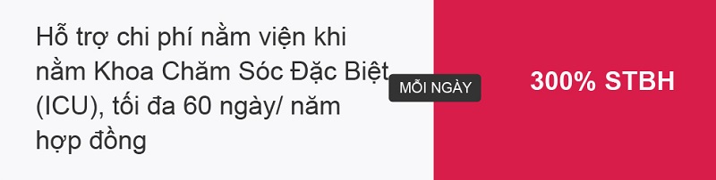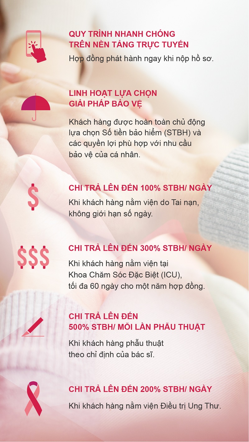 Lưu ý: Cho mỗi lần nằm viện điều trị và tính trên một ngày nằm viện, Khách hàng sẽ được chi trả quyền lợi cao nhất trong các Quyền lợi (cơ bản và mở rộng) nêu trên, ngoại trừ Quyền lợi Phẫu thuật.