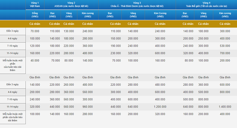 Phạm vi lãnh thổ được bảo hiểm được chia làm 4 vùng từ Việt Nam đến Toàn thế giới tùy theo yêu cầu của Khách hàng.