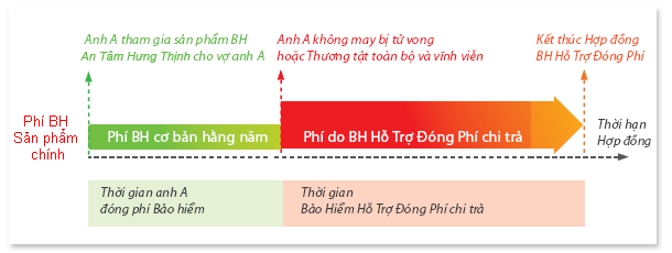 Anh A 30 tuổi tham gia sản phẩm bảo hiểm An Tâm Hưng Thịnh (sản phẩm chính) cho vợ anh A, có mua kèm sản phẩm Bảo hiểm Hỗ Trợ Đóng Phí cho chính mình.
