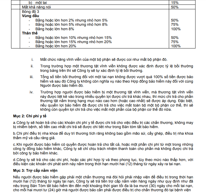 Trong khi Hợp đồng bảo hiểm này có hiệu lực, nếu người được bảo hiểm gặp phải thương tật cơ thể, do tai nạn trực tiếp, duy nhất và độc lập với bất kỳ nguyên nhân nào khác, dẫn đến tử vong hoặc thương tật vĩnh viễn trong vòng 12 tháng kể từ ngày bị tai nạn thì, trên cơ sở nhận được và chấp nhận các bằng chứng, Công ty sẽ trả tiền bồi thường theo phần trăm của Số tiền bảo hiểm (như đã nêu trong Bản Tóm tắt bảo hiểm) theo bảng sau: