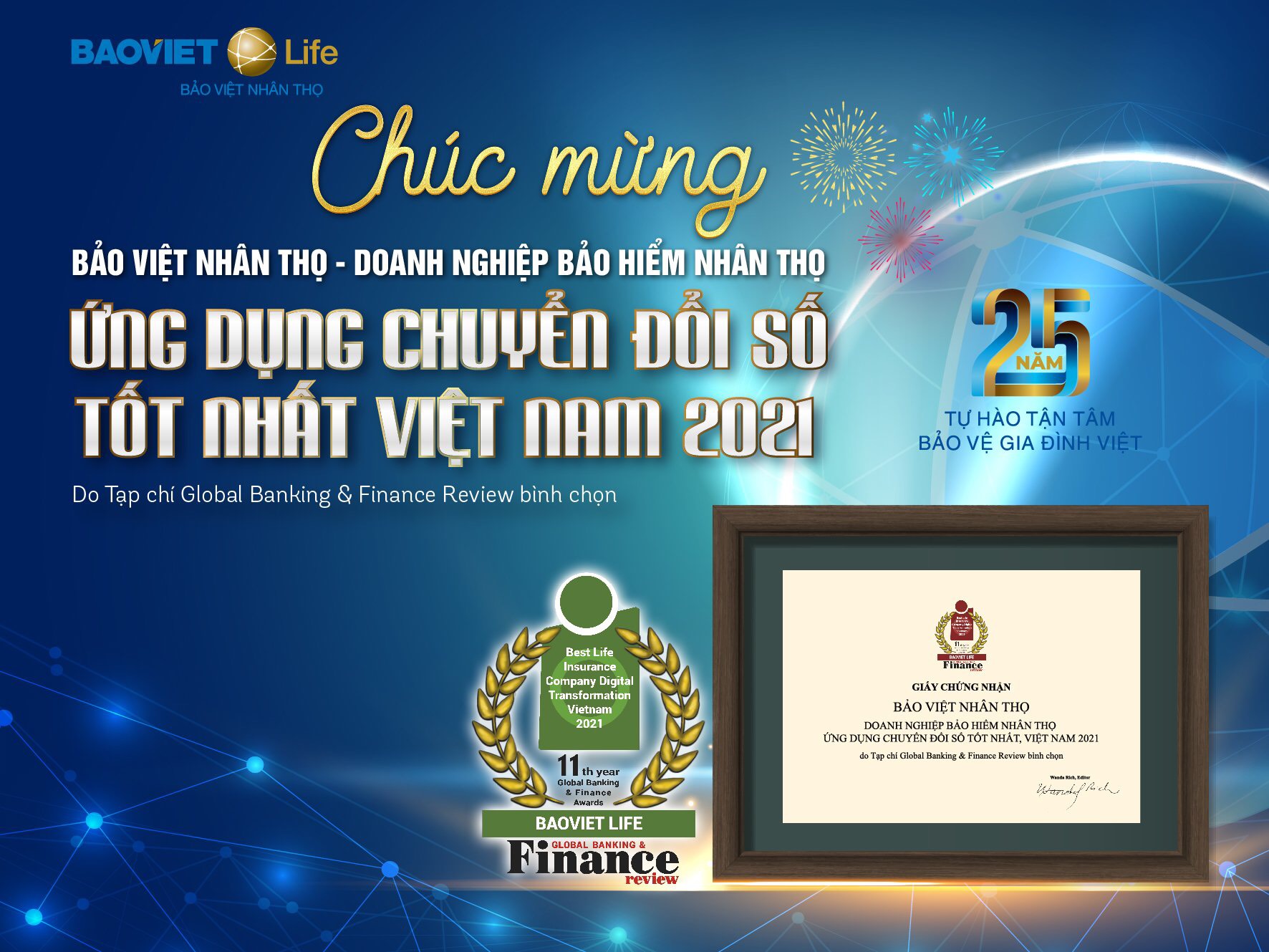 Ghi nhận những nỗ lực và sự phát triển vượt bậc trong thời gian qua, ngày 28/05/2021, Tạp chí Global Banking & Finance Review trân trọng công bố và vinh danh Bảo Việt Nhân thọ nhận giải thưởng “Doanh nghiệp bảo hiểm nhân thọ ứng dụng chuyển đổi số tốt nhất Việt Nam 2021”. Trong đó, Bảo Việt Nhân thọ là doanh nghiệp đáp ứng đầy đủ các tiêu chí khảo sát và đánh giá khách quan của giải thưởng này.