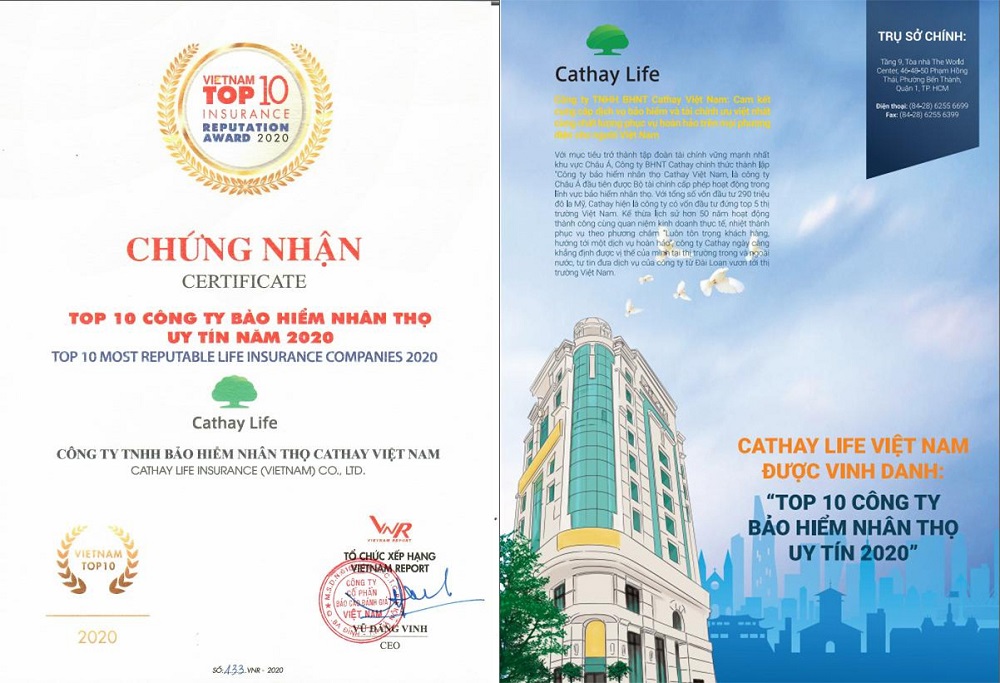 Cathay Life Việt Nam tiếp tục vinh dự nằm trong bảng xếp hạng Top 10 Công ty Bảo hiểm nhân thọ uy tín 2020. Đây là năm thứ 4 liên tiếp Cathay vinh dự nhận được sự tín nhiệm do thị trường bảo hiểm Việt Nam công nhận.
