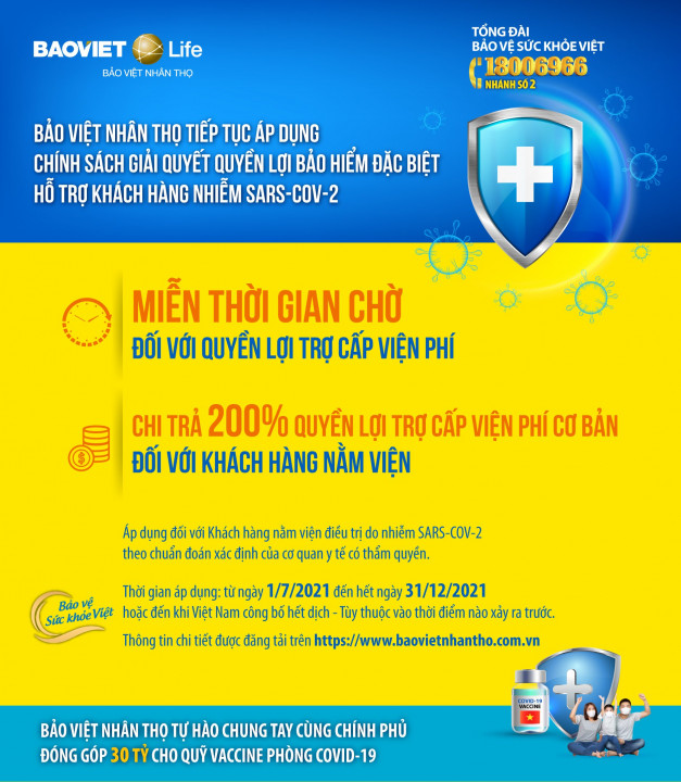 + Miễn thời gian chờ đối với quyền lợi trợ cấp viện phí theo tất cả các sản phẩm của Bảo Việt Nhân thọ trong trường hợp khách hàng phải nằm viện do nhiễm virus SARS-CoV-2