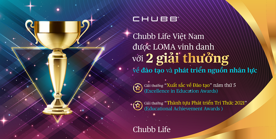 Chubb Life Việt Nam vừa được LOMA vinh danh với 2 giải thưởng về đào tạo và phát triển nguồn nhân lực trong lĩnh vực bảo hiểm nhân thọ: Giải thưởng "Xuất sắc về Đào tạo 2021” (Excellence in Education Awards), Giải thưởng "Thành tựu Phát triển Trí Thức 2021” (Educational Achievement Awards), nhằm ghi nhận những nỗ lực của công ty trong việc đào tạo và phát triển nguồn nhân lực cho ngành bảo hiểm.