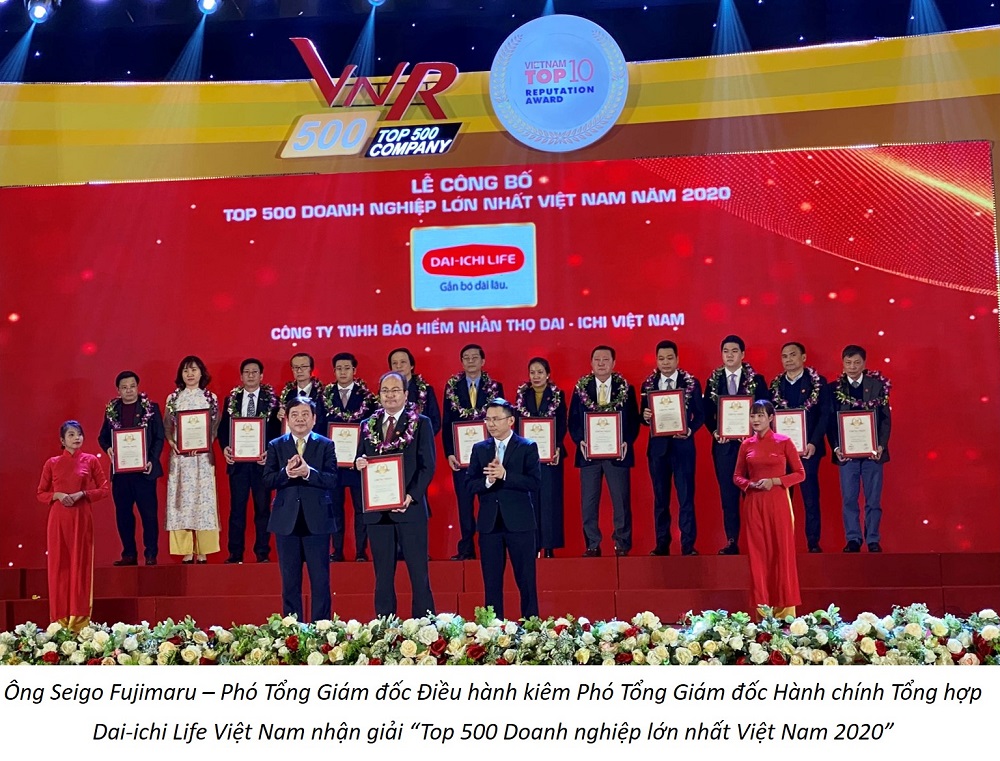Hôm nay, ngày 8/1/2021 Công ty Bảo hiểm Nhân thọ Dai-ichi Việt Nam (Dai-ichi Life Việt Nam) vừa được vinh danh trong Top 500 Doanh nghiệp lớn nhất Việt Nam năm 2020 (VNR500), trong khuôn khổ Lễ công bố Bảng xếp hạng VNR500 năm 2020 do Công ty Cổ phần Báo cáo Đánh giá Việt Nam (Vietnam Report) cùng Báo Điện tử Vietnamnet phối hợp tổ chức tại Hà Nội.