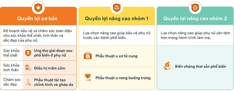 • Sản phẩm mang đến 3 nhóm quyền lợi với cấu trúc đơn giản dễ hiểu, bảo vệ phụ nữ toàn diện