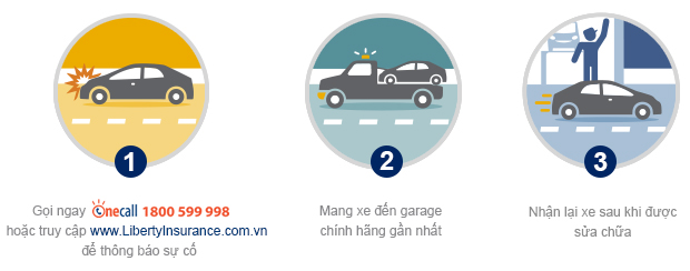 Với Bảo hiểm Xe Ô tô Liberty AutoCare, khi sự cố xảy ra, bạn chỉ cần thực hiện 3 bước trên. Chúng tôi sẽ đảm nhận tất cả những phần còn lại. Đừng ngần ngại, hãy gọi cho chúng tôi quahotline.png mọi lúc, mọi nơi để an tâm trên mọi nẻo đường cùng Bảo hiểm Liberty.