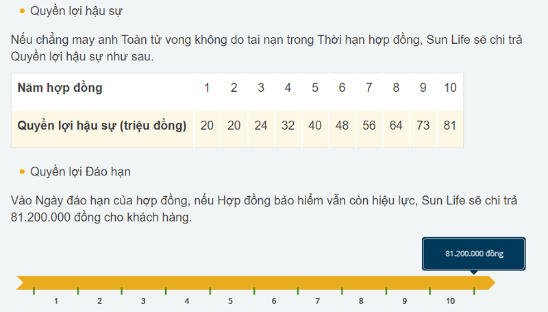 • Trong trường hợp Người được bảo hiểm chẳng may tử vong không do tai nạn gây ra, Sun Life sẽ chi trả Quyền lợi hậu sự như một sự chia sẻ với nỗi đau mất mát người thân, giúp gia đình chu toàn hậu sự cho người đã khuất. Quyền lợi hậu sự là 20.000.000 đồng hoặc tổng Phí bảo hiểm đã đóng, tùy thuộc vào số tiền nào lớn hơn.