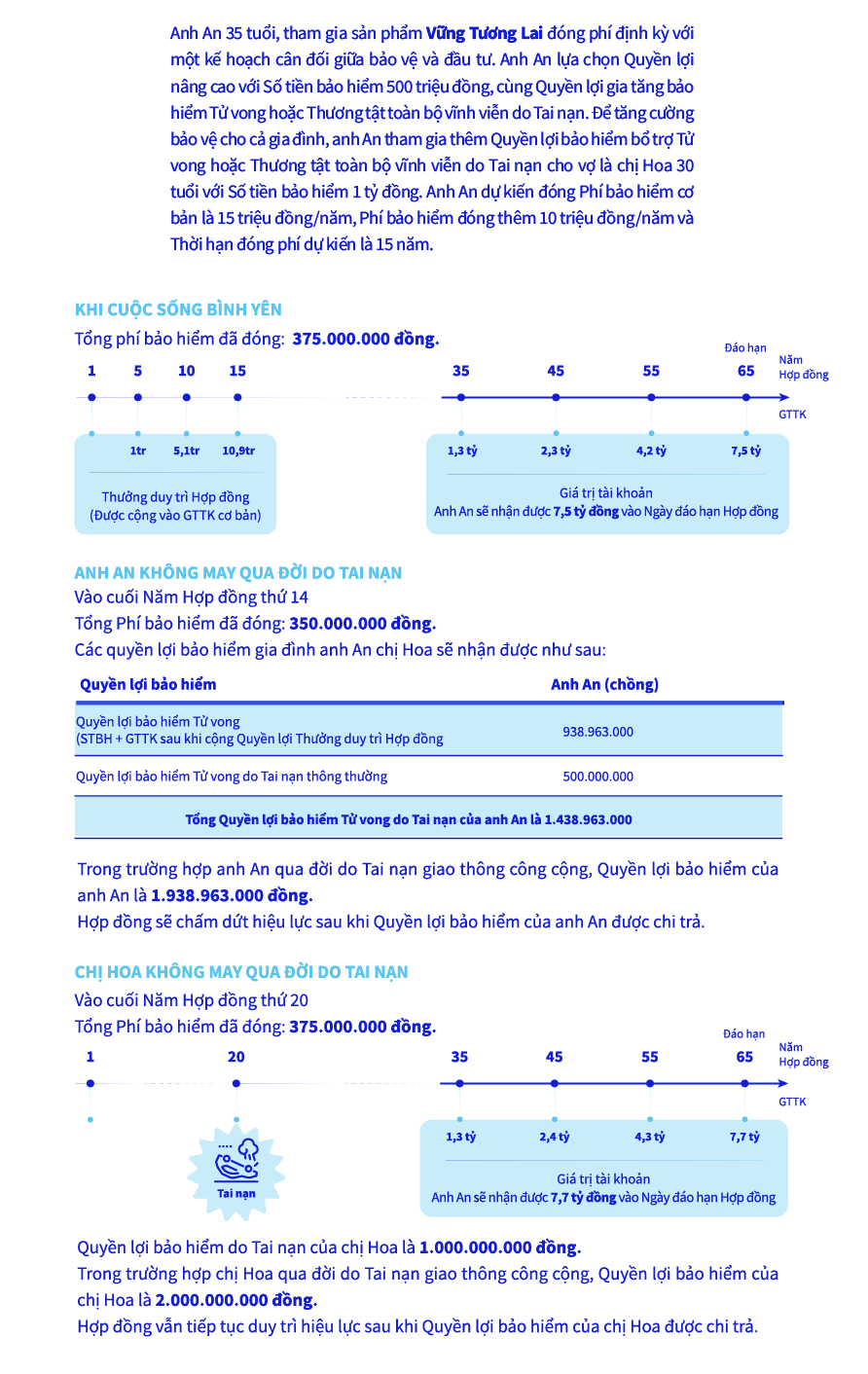 Vững Tương Lai - Là sản phẩm bảo hiểm nhân thọ Liên kết chung trọn đời, dễ dàng thiết kế linh hoạt theo nhu cầu của bạn, giúp Bạn đạt được mục tiêu nhanh chóng tại mỗi giai đoạn trong cuộc sống.